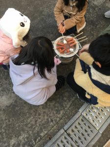 マシュマロ&ソーセージが振舞われ、我先にとマシュマロに群がる子供たち…。花より団子!!
