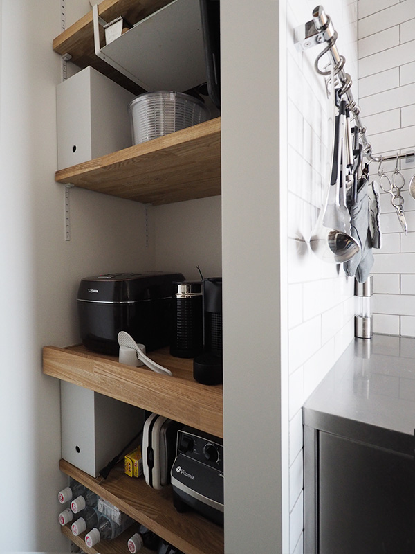 雑多になるモノは隠せる「パントリー」を設置することがK様のご要望でした。そこで造作したのが固定棚と可動棚に加えて、炊飯器やコーヒーメーカーを引き出して使用できるスライドレール付きの棚が組み込まれたミニパントリー。扉の無いオープン仕様で作られていますが、リビングからは死角なので内部は見えず、実用性とデザイン性を両立した設計です。
