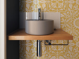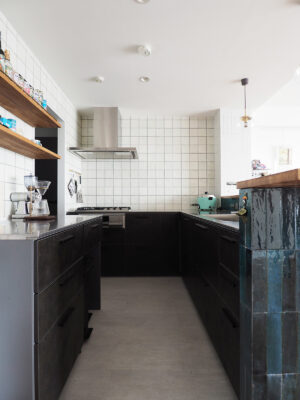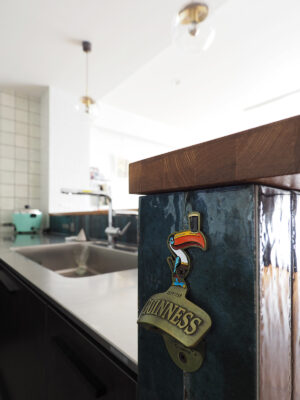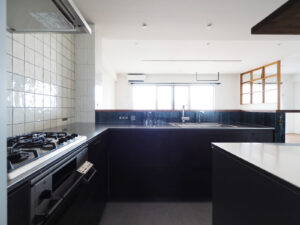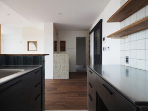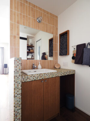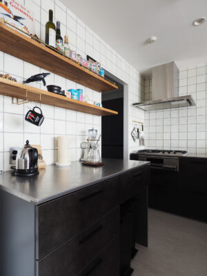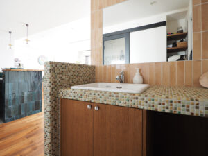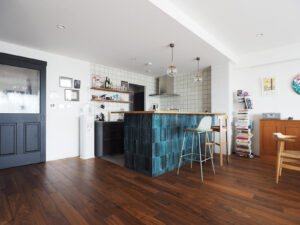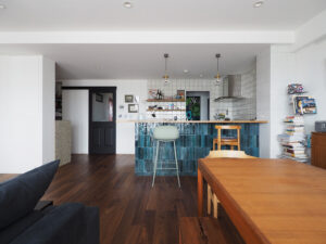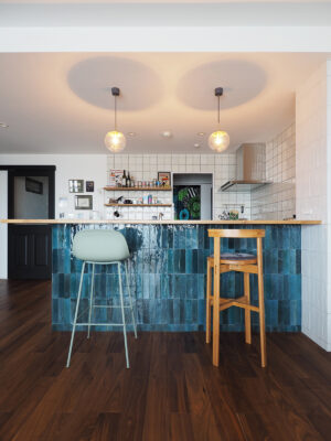 思い描いていたのは、愛犬の“ふじ”と快適に過ごせる開放的な空間。そして、大好きな「沖縄」と以前住んでいた「イギリス」の思い出が融合する住まい。イギリスの大衆居酒屋(Pub)のように、立ち飲みする文化がお好きなA様。家へ招いた友人とワイワイ楽しくおしゃべりできるよう、カウンター付きのキッチンを計画しました。キッチン腰壁に採用した、エメラルドグリーンやコバルトブルーがきらきらと揺らめくタイルは、沖縄の海をイメージして選定。目地無しで仕上げたのもこだわりの一つです。