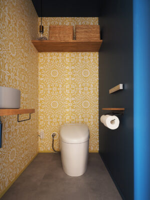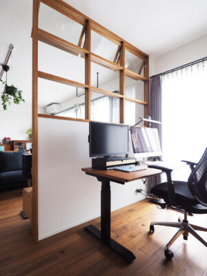 ワークスペースは、できるだけ電気に頼らず、自然の光と風を感じられる環境を重視。日当たりの良い窓辺に配置し、リビングに近く、外の景色を眺めながら過ごせる場所としました。お茶を淹れに行きやすい距離感も、さりげなく暮らしやすさを高めています。室内窓によってリビングとゆるやかに区切り、書斎としてだけでなく、楽器を楽しむ趣味の部屋としても使える多目的な空間に。休憩スペースのヌックと隣接させて「閉じすぎず、開きすぎない」そのバランスが住まい全体に心地よいリズムを生み出しています。