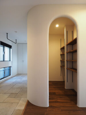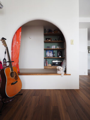 愛犬との暮らしに配慮し、床材には滑りにくいIOCの防滑塗料仕上げを採用。間取りは水回りと寝室以外を極力オープンにし、緩やかにゾーニング。必要なところだけを引き戸でゆるやかに区切ることで、開放感と暮らしやすさの両立。休憩スペースのヌックは、ふじもお気に入りのお昼寝の場所に。友人が泊まる際の客間としても機能する、多目的なスペースとなりました。ほっこりとリラックスできるよう、アーチ開口で優しい印象に。来客時には視線を遮れるよう内側にカーテンを設けました。アーチ開口の意匠は、玄関土間横のウォークインクローゼット開口と共通させ、住まい全体に統一感を持たせています。