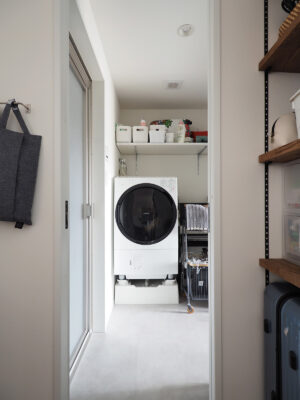 ウォークインクローゼットには衣類を集約し、2方向から出入りできるウォークスルー型を採用しました。人の動きが通り抜けることで空気が滞らず、こもりにくい計画としています。さらに、洗濯機のある脱衣室と直接つながることで、洗濯・乾燥を終えた衣類をその場で畳み、流れるように収納できる家事動線を実現。