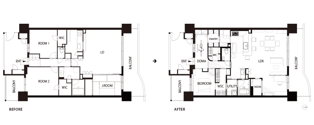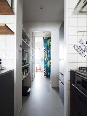 設計の軸となったのは、クローズド(独立型)だったキッチンをオープンにし、空間の要に配置すること。リビングやワークスペース、バルコニーまでを見渡せるレイアウト。キッチンに立ったとき、リビングや窓の景色、愛犬の様子まで自然と視界に入り、常に家全体とつながっていられる配置です。回遊できる間取りや十分な収納計画も重要なテーマ。玄関からは冷蔵庫・パントリーへと直接アクセスできる動線を確保。買い物後の動きをスムーズにすると同時に、冷蔵庫は来客の視線からさりげなく隠すことで、生活感が出すぎない工夫にも配慮しました。帰宅後は、鍵や上着を置き、手洗い・トイレを経てリビングへと自然につながる動線を大切に。