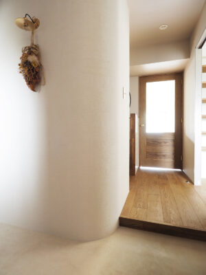 玄関脇のフリースペースだった収納は扉を撤去し、アーチ開口とR壁を造作。既存の間取りを上手く活かし、美しい広い土間玄関へ大変身しました。アーチ開口の奥には、ハンガーパイプと可動棚を設置。季節外の洋服やベビーカーを収納して、柔らかな風合いのリネンカーテンで目隠し。質感ある左官仕上げの壁に掛かった、真鍮ブラケットとスワッグが目を惹き、SHOPさながらの住空間になりました。