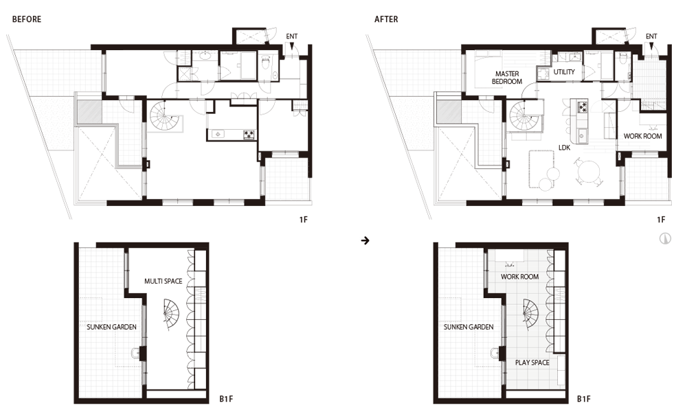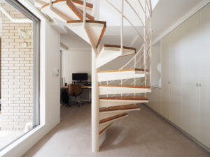 螺旋階段には、お子様の安全に配慮して壁と扉を新設。光が通るようにガラス戸で仕切りました。階段を降りると、地下一階にはご主人様のワークスペースがあります。床材の更新とアクセントタイルを張り、ライブラリーのような雰囲気を持つ空間に。LDKに面したお部屋は奥様のワークスペース。かつてはお母様が使用されていたデスクを受け継ぎ、デザイナーのお仕事をされています。北欧で育った奥様の「ヒュッゲな暮らしの価値観」から生まれた居心地の良い空間には、そこにいるだけで幸せな気持ちになる不思議な力があります。