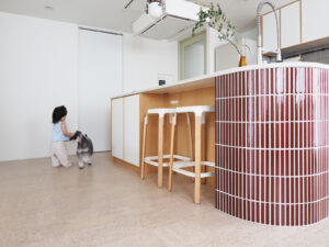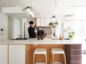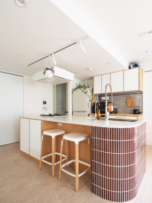 以前は独立型だったキッチンをオープンにし、廊下の壁を取り払い、広々と開放感のあるLDKへ間取り変更しました。カウンターをR曲面にした柔らかいデザインのオープンキッチンを主役に造作。バックセットと共通の扉面材はディティールにこだわり、温かみのある配色でタイルを選定。キッチンカウンターには家族みんなが集まれるようハイチェアを置けるスペースを設けました。ダイニングのペンダントライトは、奥様が学生時代から憧れていた念願のアアルトの照明を取り付けて。「キッチンを家族で囲んだり、友人を招いて楽しい時間を過ごしたり、家でゆったりすることが最高の時間になっています」と話します。