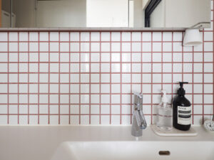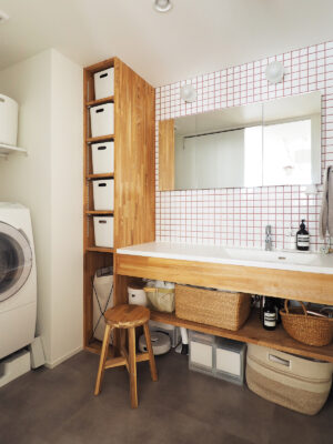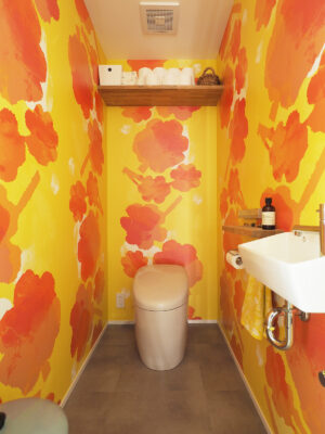 大きな花柄のトイレの壁紙は、愛犬の足形と家族の手形をコラージュしたオリジナルクロス。北欧らしい温かみのある鮮やかな色彩が目を引きます。洗面室は、洗濯物を畳むスペースを取りたいご要望から、浴室を小さくして広げました。壁面タイルの目地もワインカラーがアクセントになった可愛らしい空間に。