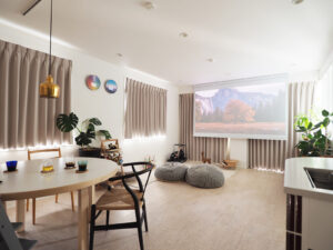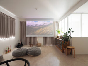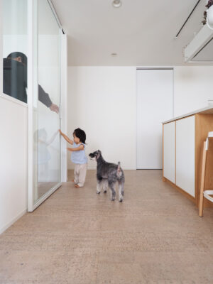 LDKの床材は、お子様と愛犬の足に優しい自然素材のコルクフロアーを採用。ほどよくクッション性があり、走り回っても安心で清掃性にも優れています。「床は汚れもサッと拭きやすく快適で、デザインもとても気に入ってます」とご主人様。安全に遊びやすく配慮されたロースタイルリビングには、TVは置かず頭上にプロジェクターのスクリーンを設置。ビーズクッションにごろんと体をあずけ、のんびりと大画面で映像を楽しむスタイルに。螺旋階段を囲んだ新設壁の脇にも、お母様から受け継いだ小物収納の引き出しが置かれています。引き出しの見出しラベルは30年前のものをそのままに。モノは少なく家具も低めに置くことで、ゆったりとしたくつろぎの時間が流れます。