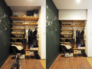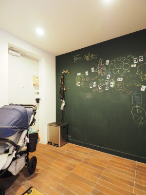 玄関は既存のシューズクローゼットを取り外し、面積を横に広くしました。土間のたたきはレンガタイルを採用し、ご夫婦の希望で壁面を黒板仕上げに。訪れた友人やゲストにチョークでイラストやメッセージを描いてもらったり、記念撮影したPolaroid写真を飾って楽しまれています。シューズクローゼットはオープンの可動棚を設置して、ロールスクリーンで目隠しもできる設計に。ちょっと置いておきたいチャイルドシートや上着を掛けておけるマルチユースな収納スペースです。