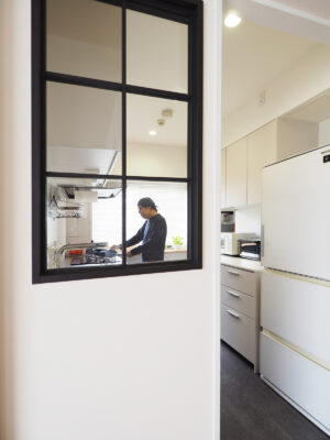 キッチンにも書斎と同じ室内窓を設け、書斎と対になったデザインに。料理しながらも家族の気配をお互いに感じることができます。キッチンの奥には造作カウンターとパントリーを設けて、既存エレクターを再利用しました。