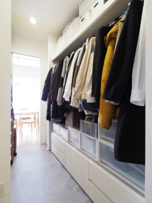 家の真ん中にはウォークスルークローゼットを配置して、ダイニング側の壁をR壁に。デザイン性だけでなく、リビングダイニング空間が広く感じられる視覚的効果も計りました。ウォークスルークローゼットの扉を開け放てば、家中の空気が循環します。以前からお持ちだった什器とエレクターを再利用し、什器サイズに合わせてクローゼット内の寸法を設計しました。洋室から、半畳タタミ敷きの和室に変更した主寝室と、息子さまのお部屋でも、以前のお住まいで愛用していたギャラリー収納を再利用。「今あるものをなるべく再利用したい」という奥さまの、モノに対する愛情と丁寧な暮らしへの想いを感じました。