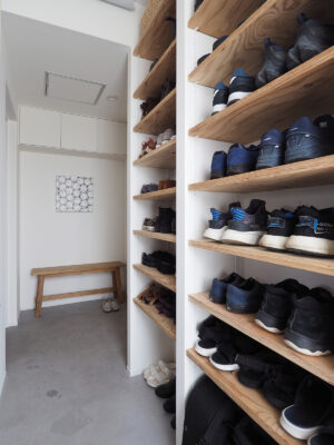 お互いのワークスペースは、リモート会議もあるので距離を離して計画。奥さまは寝室内にデスクを設け、ご主人さまは土間玄関とつながる場所に有孔ボードを貼り、その壁面前に広いデスクを設置。音を遮断できるよう、それぞれのワークスペースには扉を付けました。