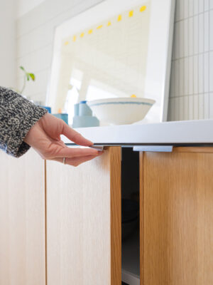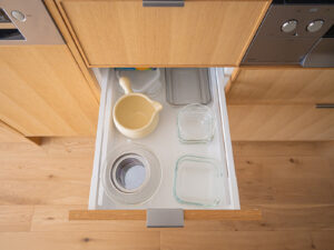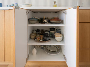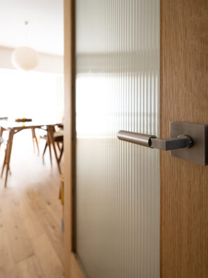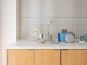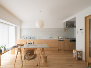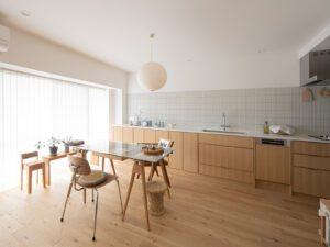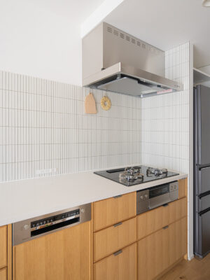 LDKは開放感を優先し、最終的に壁付けのI型キッチンを採用しました。当初は対面型も検討していましたが、空間全体の広がりを重視した結果の選択です。視線が抜け、光が奥まで届く伸びやかな空間に。長く伸びるキッチンカウンターには、オーガニックホワイトのシーザーストーンを採用。静かな存在感を持つ白が、空間全体をやさしく引き上げます。そこに食器や小物、アートを飾ることで、まるでギャラリーのような美しい日常が生まれました。壁面にはホワイトの華窯ボーダータイルをスダレ貼りで施工し、繊細な陰影が光を受けて表情を変えます。床には節の表情が豊かなオーク材を使用し、自然素材ならではの温かみをプラス。キッチン収納には、ワントーン明るいホワイトオークを用いた造作扉を取り付け、細部まで丁寧に仕上げました。