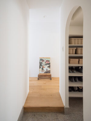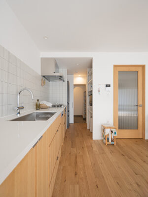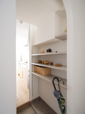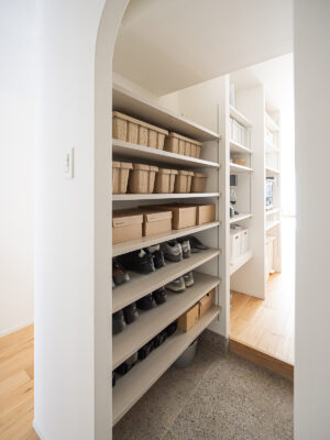 今回のプランの大きなポイントとなったのは、キッチンまわりの動線設計です。ご要望いただいたのは2WAYの回遊動線。玄関土間からキッチンへと抜けられる導線を設けることで、日常の動きに無駄がなく、自然と暮らしやすさが生まれます。その動線の途中には、R開口を採用。やわらかな曲線が空間に奥行きを与え、まるで路地のような心地よい抜け感を演出しています。玄関側はシューズクロークとして、キッチン側はパントリー兼家電収納として機能を分け、使い勝手とデザイン性を両立しました。買い物から帰宅し、そのまま食材を収納できる流れも大きな魅力のひとつです。