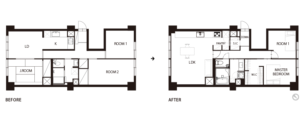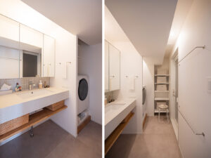 洗面スペースには、テラゾー調のシーザーストーンを採用し、上質で清潔感のある空間に仕上げています。日常使いの場所でありながら、ふと気持ちが整うような落ち着いた雰囲気。主寝室にはウォークインクローゼットを設け、収納力を確保。さらに、物件購入時に引き継いだキャビネットをそのまま活用することで、新しさの中にこれまでの時間も自然に溶け込ませました。