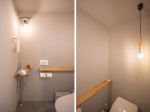 トイレはドアの位置を廊下側へ移動し、室内にほんのり遊び心をプラス。ダウンライトだけでまとめるのではなく、ブラケットとペンダント照明を組み合わせて光に変化を付けました。ペンダントはH様ご自身が選ばれたものを設置しました。空間にさりげない個性が宿ります。床には玄関土間と同様に、洗い出しの質感を再現したタイルを採用し、住まい全体の統一感を意識しました。