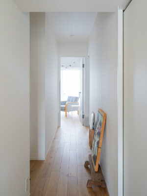 リビングにはあえてテレビを置かず、プロジェクターで映像を楽しむスタイルに。余白を大切にしながら、暮らしそのものを楽しむという選択です。全体を白を基調としたトーンでまとめることで統一感を持たせ、リビングドアには大判ガラスの木製框扉を採用。住まいの奥まで自然光が届くよう設計しました。